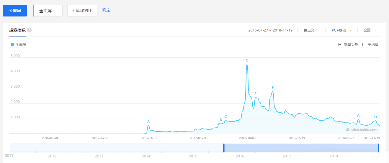百度指数显示,关键词“全面屏”搜索指数最大值出现在2017年9月份,正值iPhone X发布。自那之后,刘海屏也变成全面屏手机最常见造型。